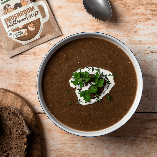 Earthy mushrooms meet fragrant thyme and a twist of black pepper in this naturally rich soup designed for body and mind. Each serving contains 4000mg of Lion’s Mane mushroom extract, plus naturally sourced vitamin D and B12 from shiitake mushrooms to support energy, focus, and everyday wellbeing.