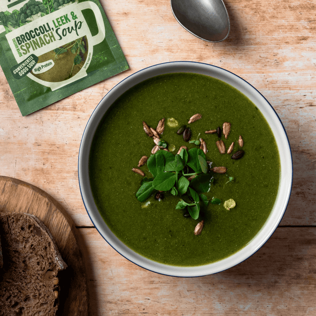 Vibrant greens meet creamy smoothness in this high protein nutrient-rich soup crafted from real vegetables - broccoli, spinach, and leek - and powered with natural sunflower protein for clean, plant-based strength. Gently dehydrated to preserve their freshness and flavour, every serving delivers pure, balanced nourishment you can taste.