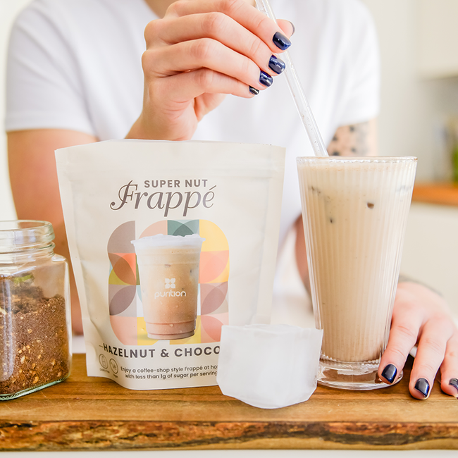 Super Nut Frappés (prepared with almond milk) contain around 95% less sugar than a typical coffee shop Frappuccino.